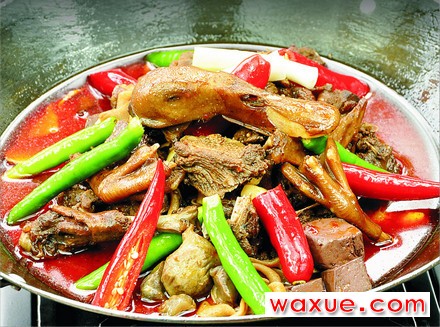 鸭按辣的程度分三种:巨辣、中辣、微辣。凡人吃中辣,就着火锅,边吃边冒汗。