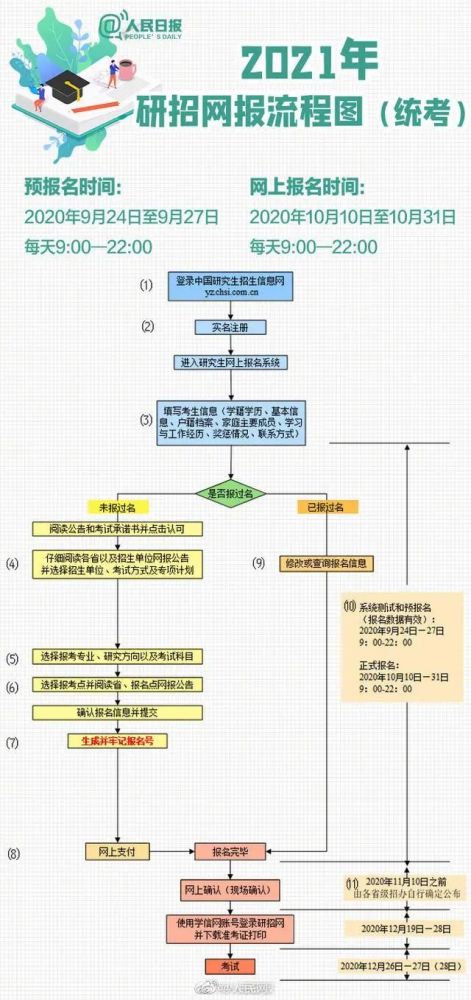 10月10日至31日,每天9:00-22:00,考生可登录全国硕士研究生招生考试网上报名平台进行正式报名(尽量避开网报开始阶段的高峰期)。预报名成功后,报名数据有效,不需要在正式报名阶段再次报名。