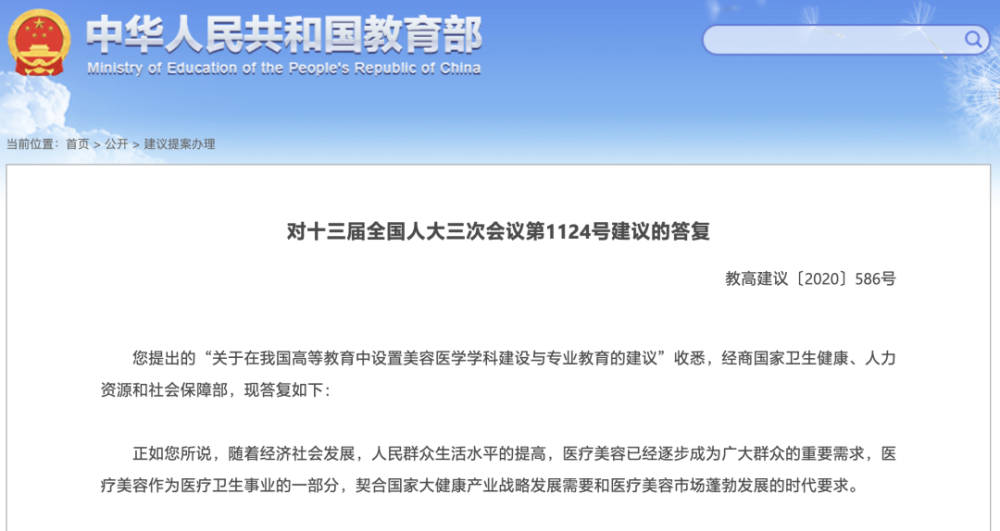 教育部在对十三届全国人大三次会议第1124号建议的答复中指出,随着经济社会发展,人民群众生活水平的提高,医疗美容已经逐步成为广大群众的重要需求,教育部大力支持美容医学学科建设和人才培养工作。