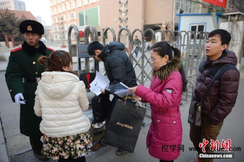 1月4日,内蒙古呼和浩特一考场外,武警官兵维持考场秩序。当日,2014年全国硕士研究生招生考试开考。今年考研首次取消“不超过40岁”的年龄限制。