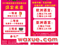 亚洲语言:三期以下9折,三期以上8.5折(限今年预定,明年上课的学生)。还可参与圣诞折扣抽奖活动!!100个名额,6.8-9折,百分百中奖,先定先得,老学员续费也可参与,赶紧预定起来吧!!!》》》详情请电话联系!