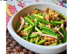 制作流程:将择洗好的鱿鱼须切成豌豆粒,鲜猪肉切成小粒,蒜苗切成小段,鲜青红椒切成粒,葱姜切好待用