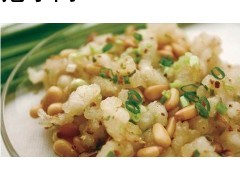 准备好材料后先将鱼肉加工成粒状,放入碗中加精盐、料酒、鸡蛋清打散、湿淀粉上浆,松子入温油锅浸炸至金黄色捞出。将葱姜拍松放入碗中加料酒、清水少许制成葱姜酒汁、