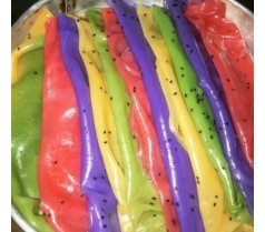 七彩果蔬凉皮采用时令水果、蔬菜与传统的凉皮工艺相结合,手工加工出多种色彩及多种口味的,传统与食尚健康、绿色为一体的彩色水果蔬菜凉皮。为了保证陕西风味原汁原味,辣椒采用陕西凤翔线椒,传统工艺研磨而成,醋采用陕西岐山天缘香醋;凉皮的制作除保留了传统的普通面皮,采用新工艺制作出翡翠菠菜凉皮、橙色胡萝卜凉皮、黄色南瓜凉皮、紫色甘蓝凉皮、黑米皮、什锦凉皮、草莓凉皮及各种时令水果凉皮。纯天然食尚健康