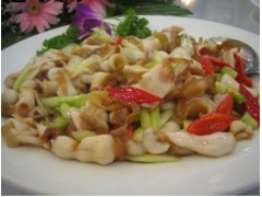 3.净锅上火加少许油,葱、姜炒出香味,飞甜面酱,烹入料酒,加少许清汤,放盐、味精、白糖,下入海螺翻炒,水淀粉勾芡,淋明油,颠翻均匀出锅装盘即可。