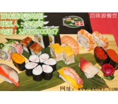 新乡百味源小吃培训中心教做的寿司:主要原料为寿司米和日本粳米,其特点是色泽白净,颗粒圆润,用它煮出的饭不仅弹性好,有嚼头,且具有较大的黏性。包卷寿司的外皮所用的原料,以优质的海苔、紫菜、海带、蛋皮、豆腐皮、春卷皮、大白菜等为常见。寿司的馅料丰富多彩,且最能体现寿司的特色。馅料所用的原料有海鱼、蟹肉、贝类、淡水鱼、煎蛋和时令鲜蔬,如香菇、黄瓜、生菜等等。