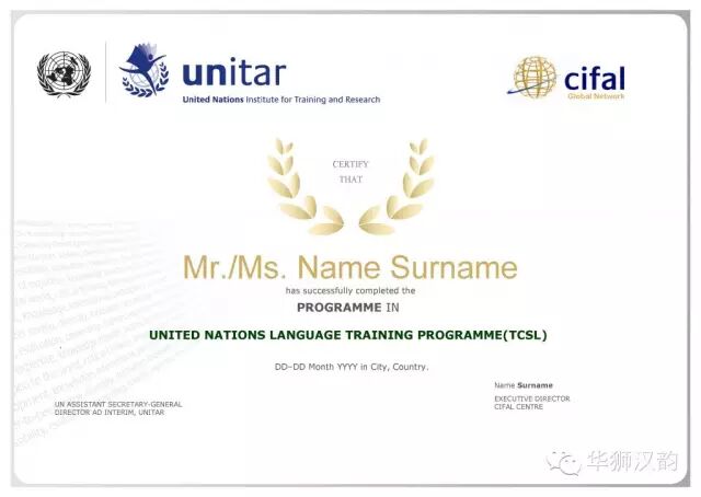 ►由联合国训练研究所(UNITAR)颁发有统一编号的《UNITED NATIONS LanguageTraining Programme-TCSL》可上CIFAL官网查询:www.cifalshanghai.org;