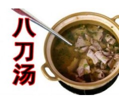 八刀汤是一道色香味俱全的汉族名点,属于粤菜系。广东紫金县的"八刀汤",算得上是的客家人对猪的完美演绎。"八刀汤"是对着用黑麦草、番薯叶喂养的紫金蓝塘猪的八个部位,切割一刀,分别包括猪心、猪腰、猪肝、猪粉肠、猪肚、猪肺、猪胰脏、瘦肉等等熬成的汤。切下的猪件精华,在上面洒放少许的盐花、胡椒粉、味精,倒入山泉开水里,加盖,煮十分钟,掀锅盖,见猪件精华绽开如花,盛进葱花垫底的大汤碗即可。在煮灼汤时,绝不准搅动翻转猪件精华,以免破坏猪件的爽脆口感。