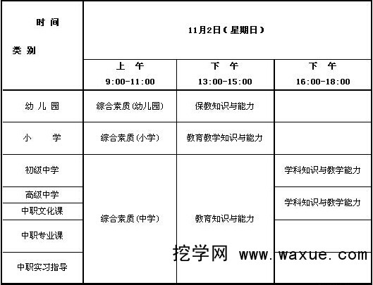 根据教育部考试中心《关于2014年中小学教师资格考试考务相关事项的通知》(教试中心函[2013]222号)和安徽省教育厅《关于印发<安徽省中小学教师资格考试改革试点工作实施方案>和<中小学教师资格定期注册实施细则>的通知》(皖教师﹝2013﹞9号)精神,2014年中小学教师资格考试下半年笔试时间为2014年11月2日。现将有关事项公告如下: